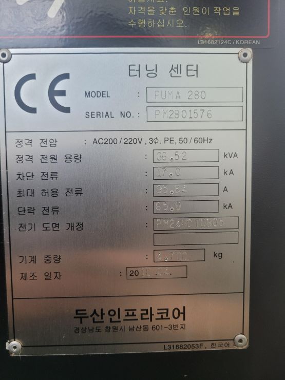 장비명 : PUMA 280, 두산 10인치