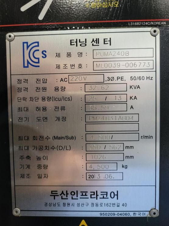 두산 8인치 CNC선반 PUMA240B 중고CNC선반