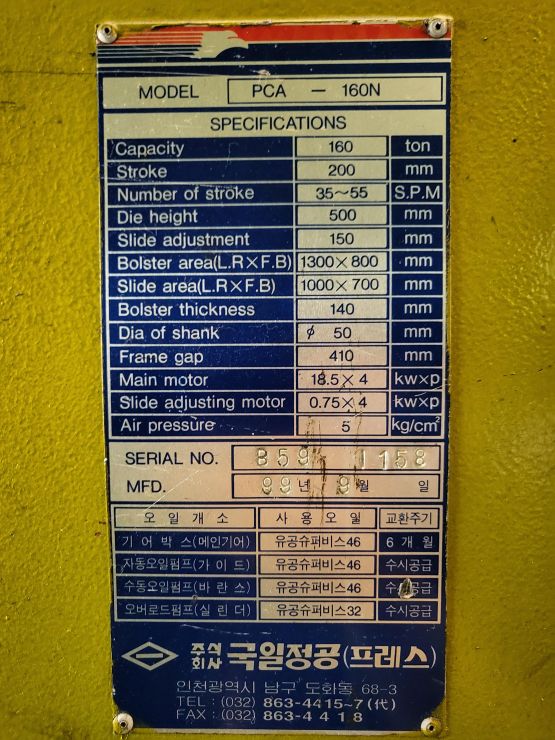 "(주) 세광기계 " 국일 PCS-160 프레스 판매 합니다.