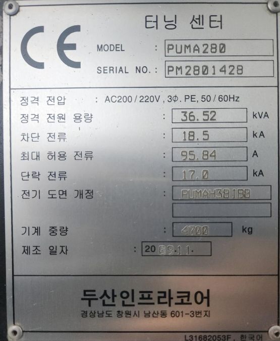 장비명 : PUMA280 두산 10인치 선반