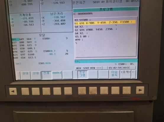 - 규격 FANUC 0i-MD, AICC, 데이터서버, 오토파워오프 BT40, 12000RPM(직결식), ATC 30EA, 공구길이측정장치, 스핀들오일쿨러, 칩컨베이어/칩통