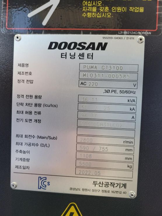 두산 12인치 CNC선반 PUMA GT3100 중고CNC선반