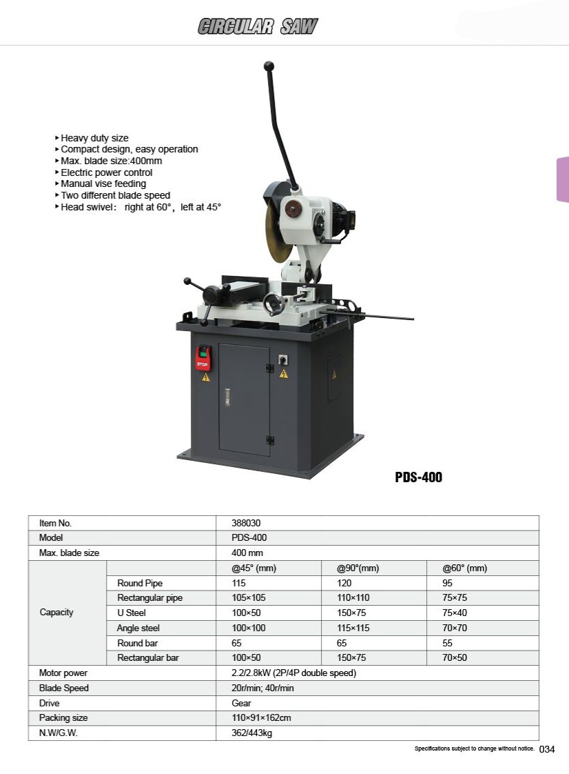 | 제품상세설명 | 모터 3.7마력[2.8kw]이 장착되었고, 400파이 하이스 원형톱날이 장착되는 강력형 수동 원형톱기계입니다. 바이스 및 절단 모두 수동입니다. 각도는 0도~60도까지 돌아갑니다. 직각 절단 시 120파이까지, 45도 절단 시 115파이까지 절단 가능합니다. 기계 순수중량은 약370킬로로써 유사품 대비 약 50킬로이상 더 무겁습니다. 대용량 감속기 및 양질의 주물사용으로 무게가 많이 나갑니다. |