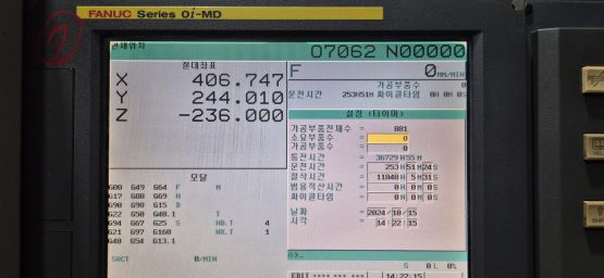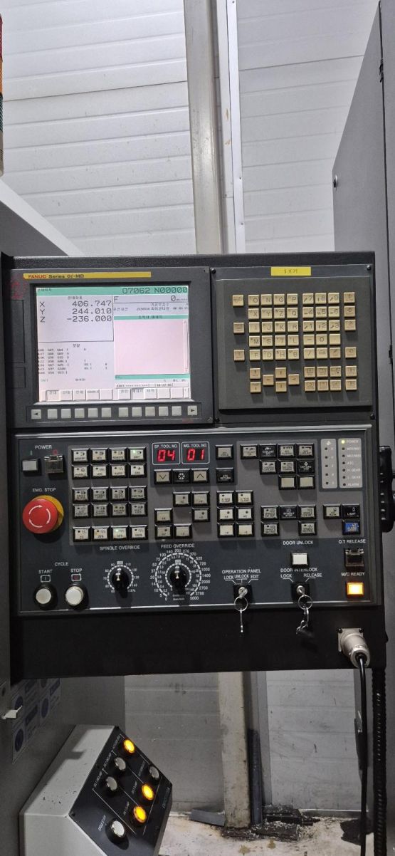 - 규격 FANUC 0i-MD, AICC2, 데이터서버, 에어블로우, 오토파워오프 BT40, 8000RPM, ATC 30EA, 주축관통절삭유, 유압유니트, 칩컨베이어/칩통