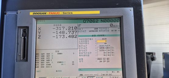 - 규격 FANUC 0i-MD, 에어블로우, 오토파워오프, BT40, 12000RPM(벨트타입), ATC 30EA, 스핀들오일쿨러, 칩컨베이어(우측방)/칩통