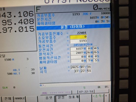 - 규격 FANUC 0i-MF, AICC2, 데이터서버, 오토파워오프 BT50, 10000RPM, ATC 40EA, 3축 리니어스케일, 스핀들오일쿨러, 칩컨베이어/칩통