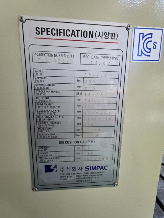 심팩프레스 200톤 CS-200 다이쿠션有 (2011년 7월)