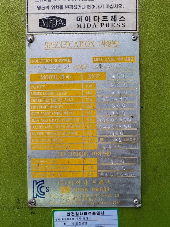 "(주) 세광기계" MCP - 200 T 프레스 판매 합니다.