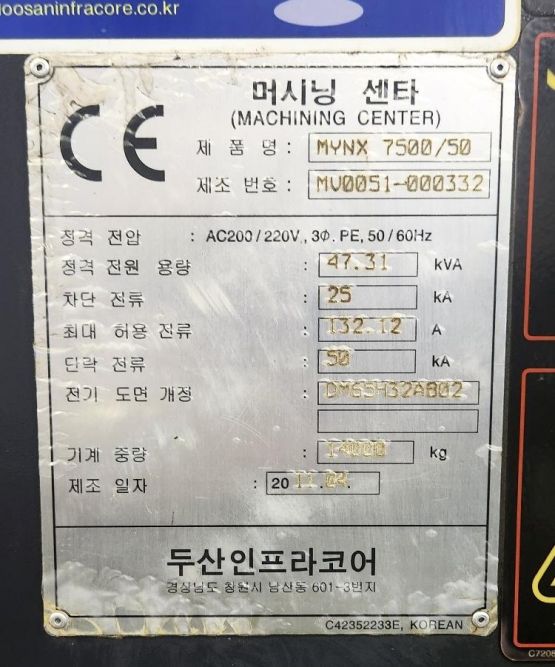 두산 7.5호 머시닝센터 MYNX7500 (2011년식)