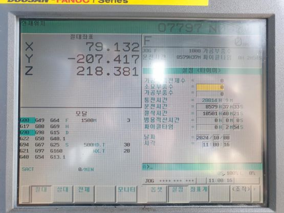 - 규격 FANUC 0i-MD, AICC1, BT40, 12000RPM, ATC 30EA, 스핀들오일쿨러, 칩컨베이어(좌측방)/칩통