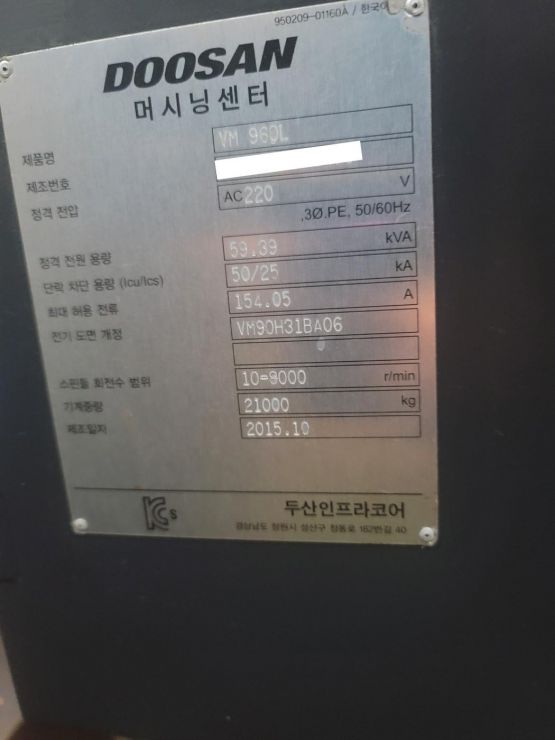 두산 9.6호 머시닝센터(풀커버) VM960L 중고머시닝센타