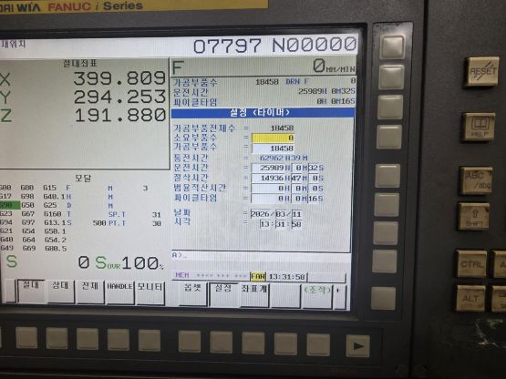 - 규격 FANUC 0i-MF, HD-WIA, 오토파워오프, BT40, 12000RPM, ATC 30EA 주축관통절삭유, 스핀들오일쿨러, 칩컨베이어/칩통