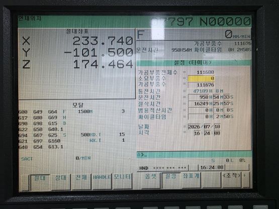 - 규격 FANUC 0i-MD, AICC2, 데이터서버, 에어블로우, 오토파워오프 BT40, 8000RPM(벨트식), ATC 30EA, 스핀들오일쿨러, 칩컨베이어/칩통