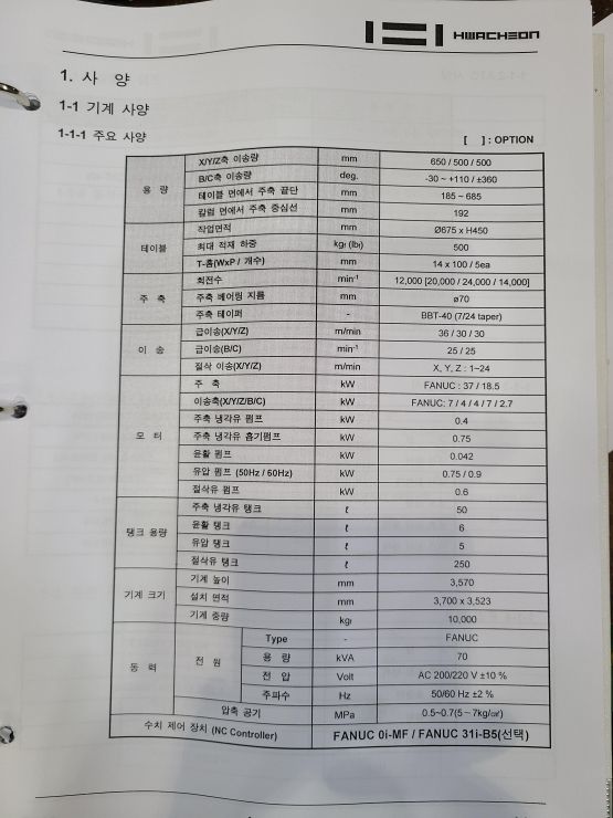X/Y/Z 이동거리: 650/500/500mm,  스핀들 회전수: 12000rpm BBT40, Controller: Fanuc-0iMF