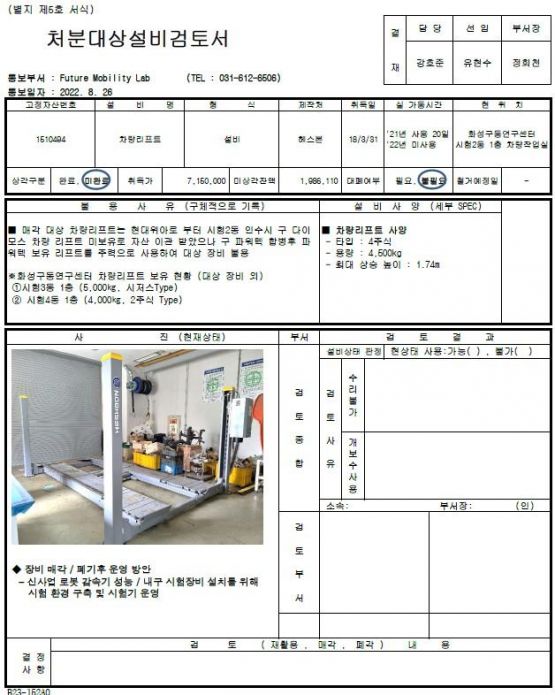 2. 해당장비의 처분대상설비검토서는 현대자동차 그룹 VAATZ 유휴자산 관리 경매공고에서 확인 가능